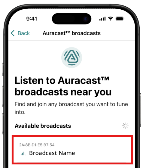As the scan completes, any nearby Auracast broadcasts will appear in a list under “Available broadcasts”.