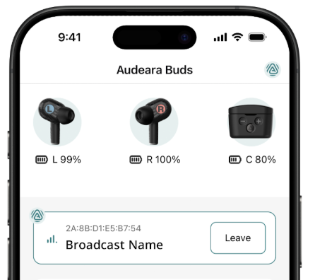 The active broadcast panel will show the connected broadcast name. To switch broadcasts: Click back onto the Auracast logo in the top right to scan for more available broadcasts. To leave a broadcast: Tap the “Leave” button on the broadcast panel. Your Audeara Buds will return to your usual Bluetooth audio. |